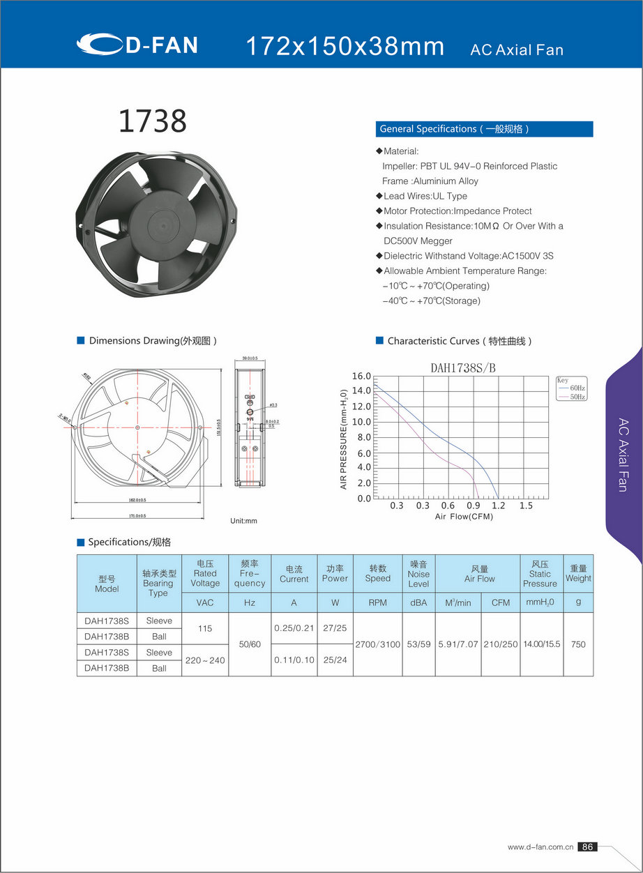 材料: 叶轮:PBT UL 94V-0增强塑料框架铝合金 导线:UL型 电机保护:阻抗保护 绝缘电阻:1欧姆或以上,带DC500V高阻表 介电耐压:AC1500V 3S 允许环境温度范围: -10℃-+70℃(运行) -40℃-+70℃(储存)